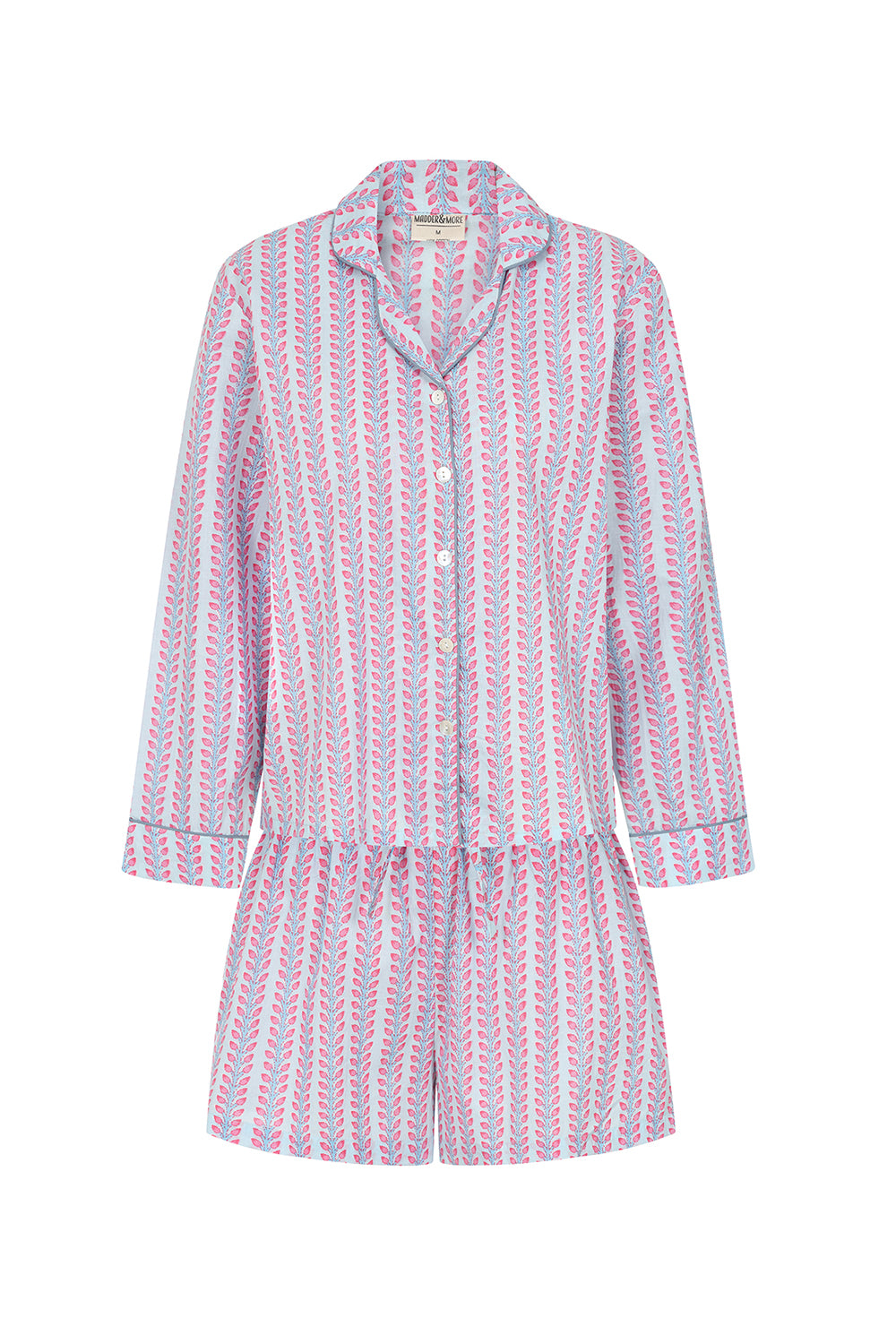 Our pink and blue floral stripe brings together the classic striped pyjama with traditional block printing designs, adding a modern twist to the ancient craft. All our pyjamas are handmade by artisans in Jaipur and come in a matching pyjama bag. Their oversized, boxy fit and supersoft cotton are perfect for cosy nights in. The fabric is hand printed so please allow for discrepancies in designs as each set is unique.