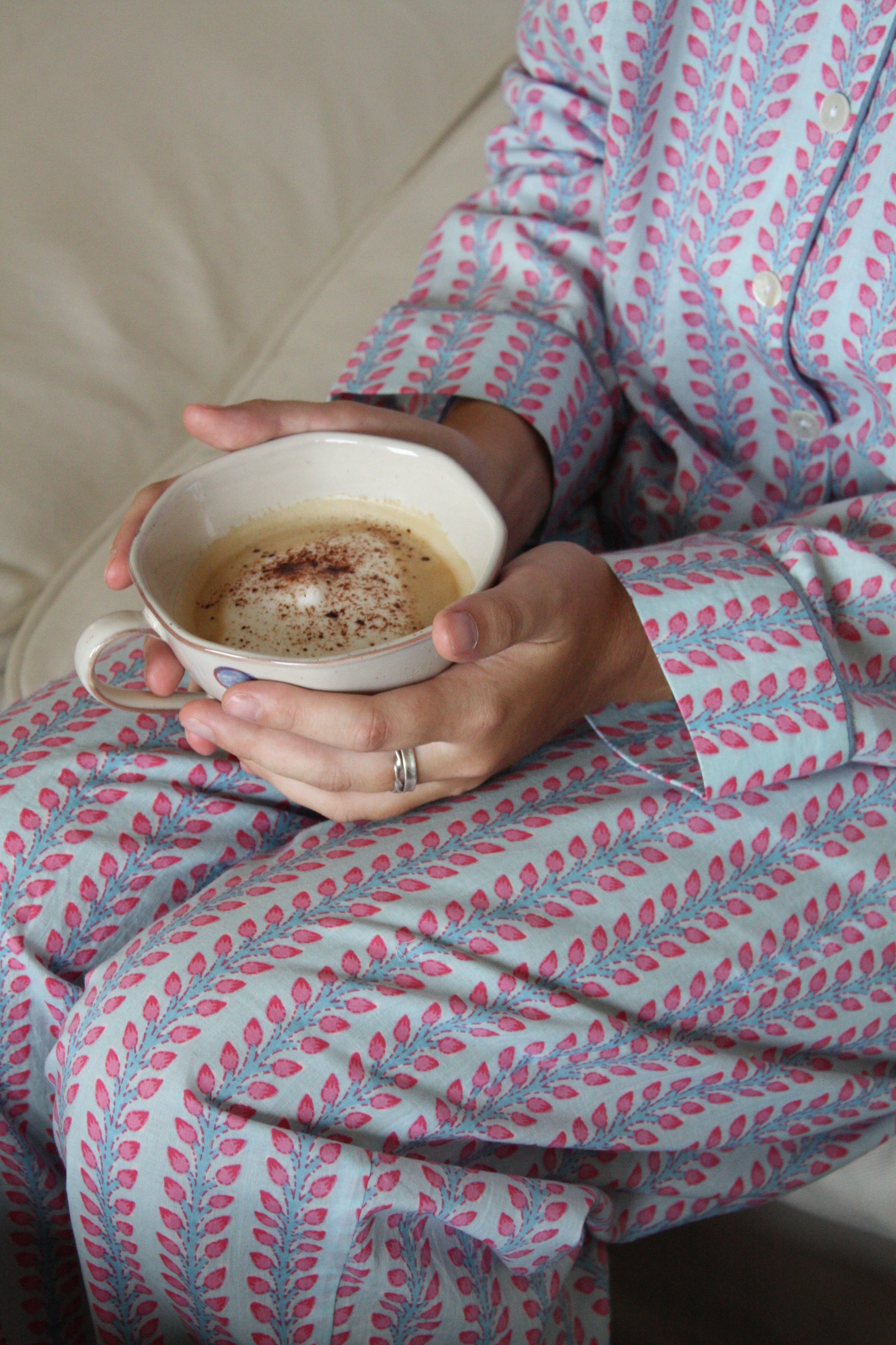 Our pink and blue floral stripe brings together the classic striped pyjama with traditional block printing designs, adding a modern twist to the ancient craft. All our trousers are handmade by artisans in Jaipur. Their oversized, boxy fit and supersoft cotton are perfect for taking you from your bed to the beach! The fabric is hand printed so please allow for discrepancies in designs as each set is unique.
