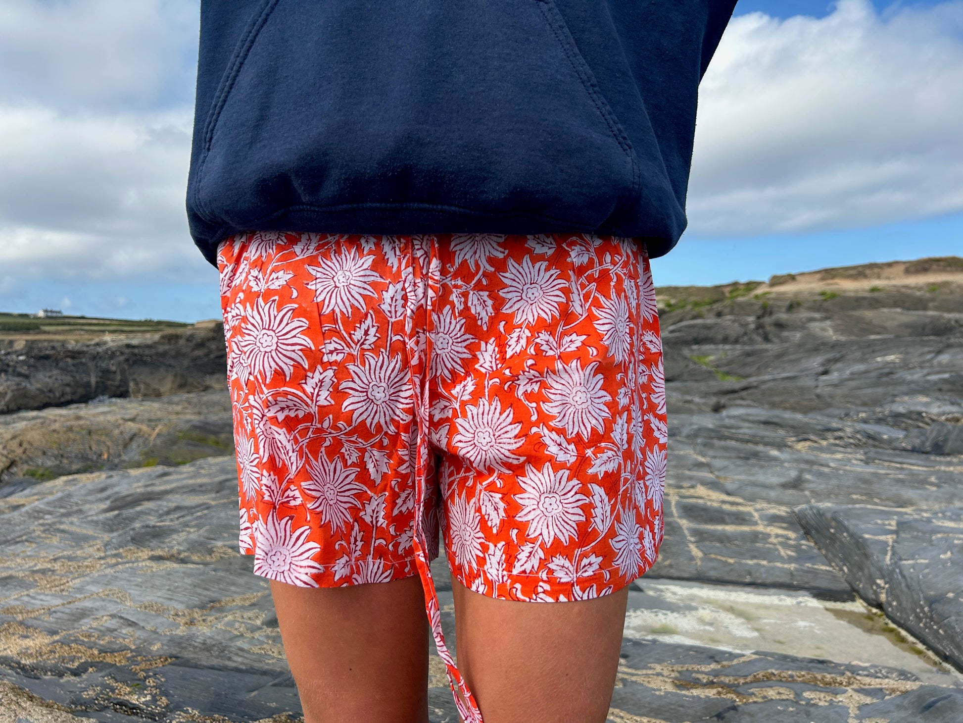 Block printed pyjama shorts handmade in Jaipur. Perfect for lazy days, beach fun and summer nights. The fabric is hand printed so please allow for small discrepancies in designs as each pair is unique.