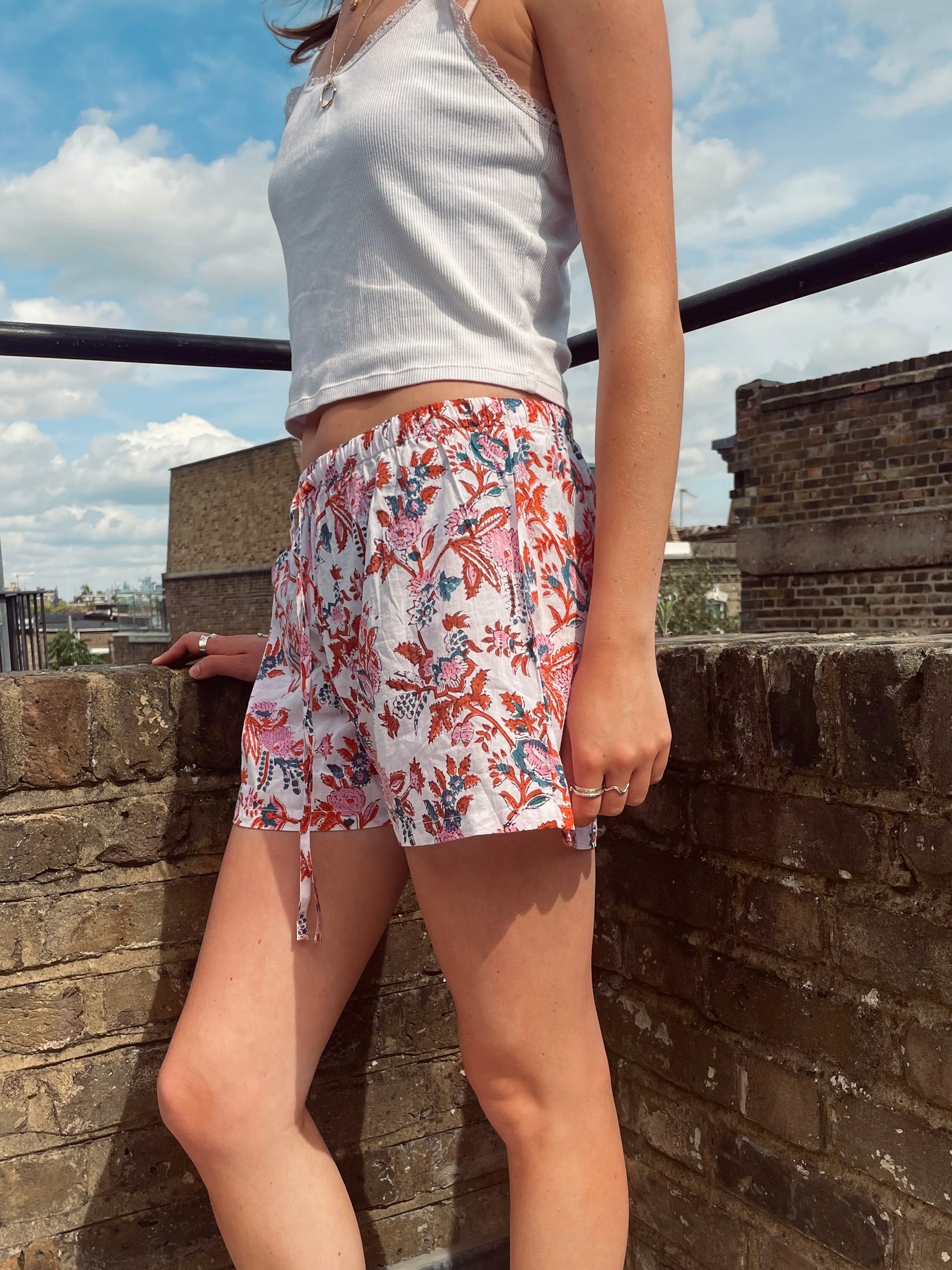 Block printed pyjama shorts handmade in Jaipur. Perfect for lazy days, beach fun and summer nights. The fabric is hand printed so please allow for small discrepancies in designs as each pair is unique.