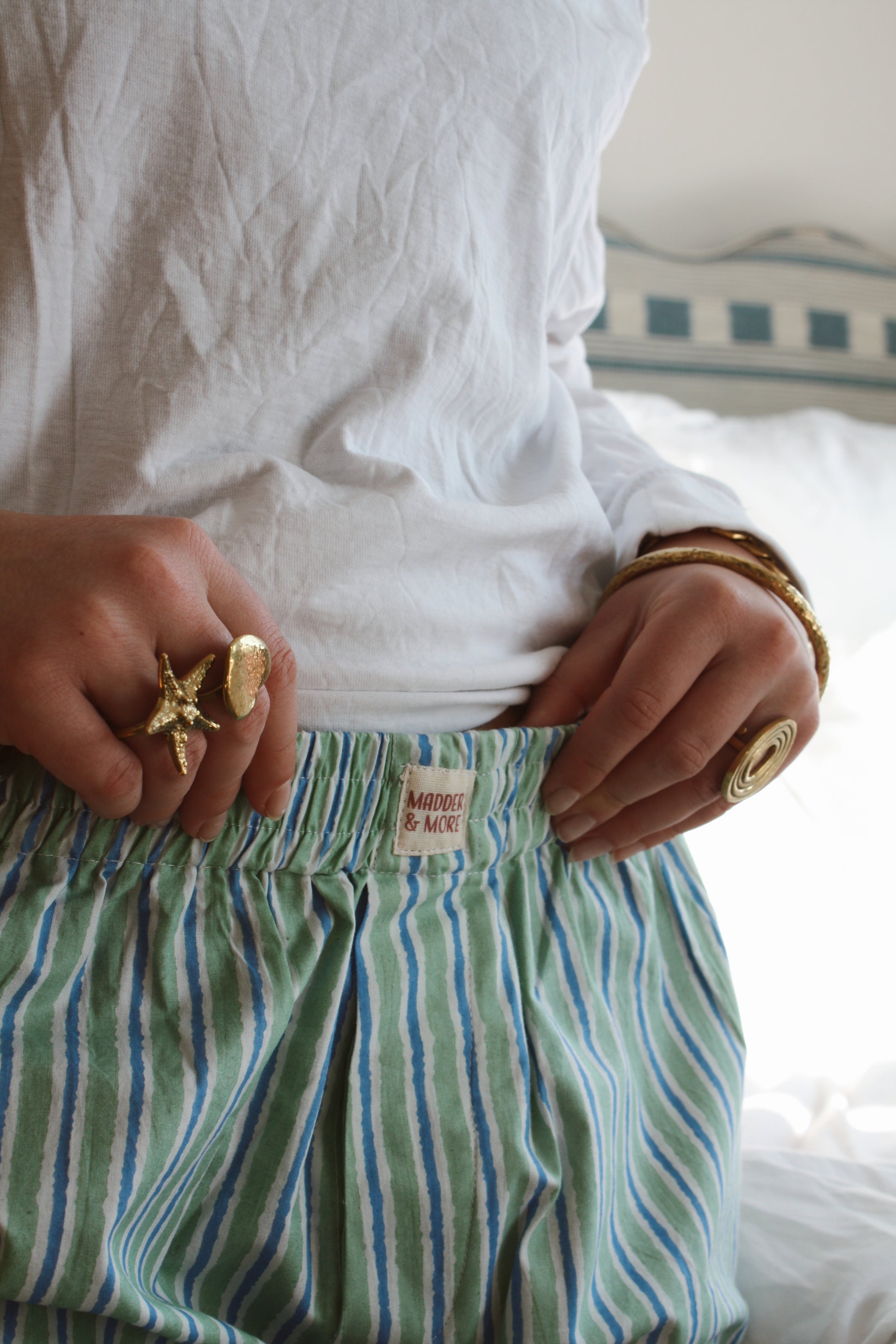 Screen printed unisex boxers handmade in Jaipur. Perfect for lazy days, sleep wear, underwear or a beach trip! Our shorts are made with poplin cotton so they are light and breathable, whilst holding their shape. Each pair has a thick elasticated waistband, a concealed front opening with button, and side slit details. The fabric is hand printed so please allow for small discrepancies in designs as each pair is unique.