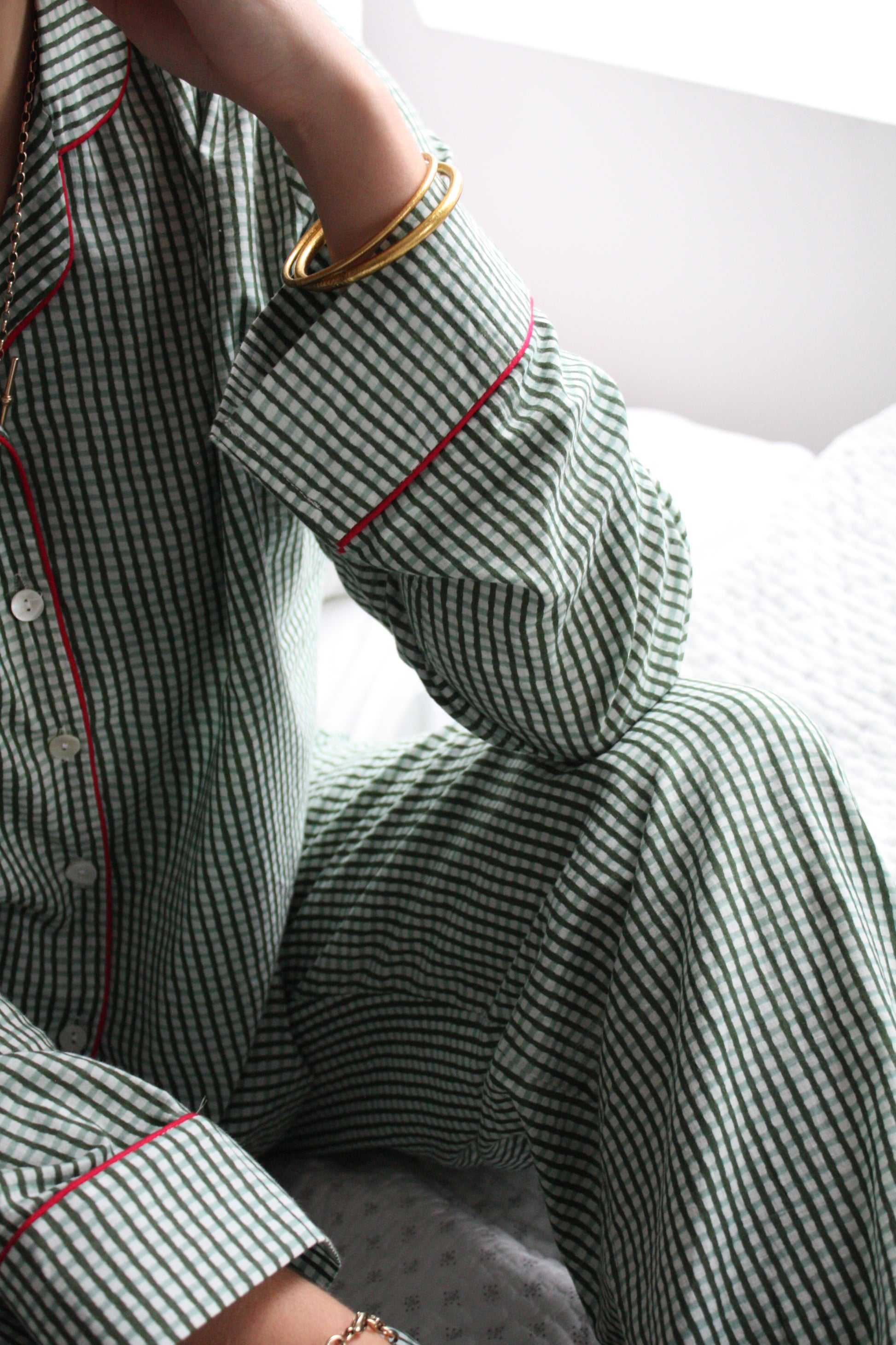 We all love a bit of gingham, but have you seen hand printed gingham before? Our two-tone green gingham design with its contrast scarlet piping might just be our favourite yet! All our pyjamas are handmade by artisans in Jaipur and come in a matching pyjama bag. Their oversized, boxy fit and supersoft cotton are perfect for cosy nights in. The fabric is hand printed so please allow for discrepancies in designs as each set is unique.