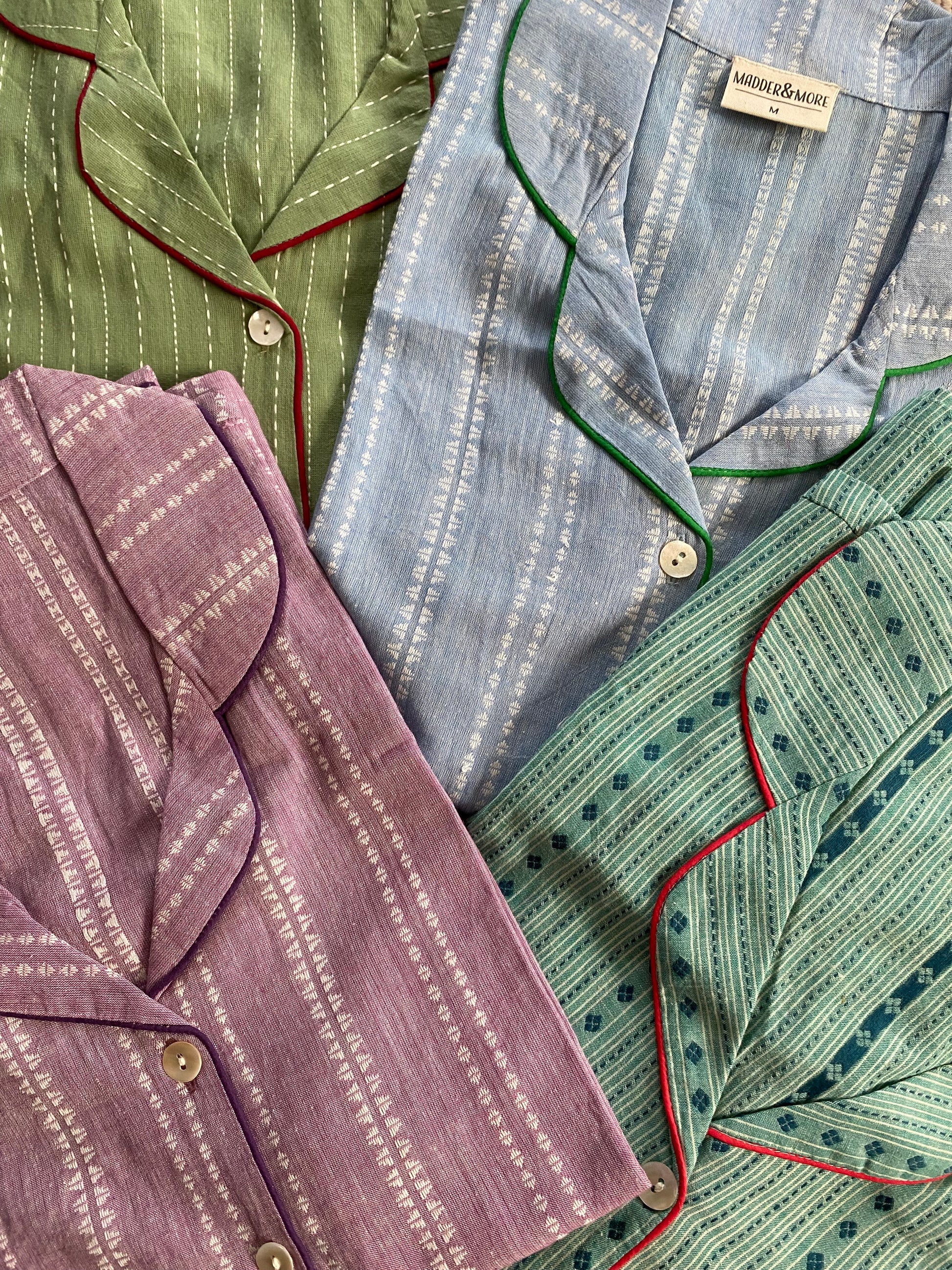 Our new handloom pyjamas are made with high quality cotton, perfect for winter nights. A little heavier than our printed pyjamas, they are even softer and lovely and warm. All our pyjamas are handmade by artisans in Jaipur and come in a matching pyjama bag. Their oversized, boxy fit and supersoft cotton are perfect for cosy nights in. The fabric is woven by hand so please allow for discrepancies in designs as each set is unique.