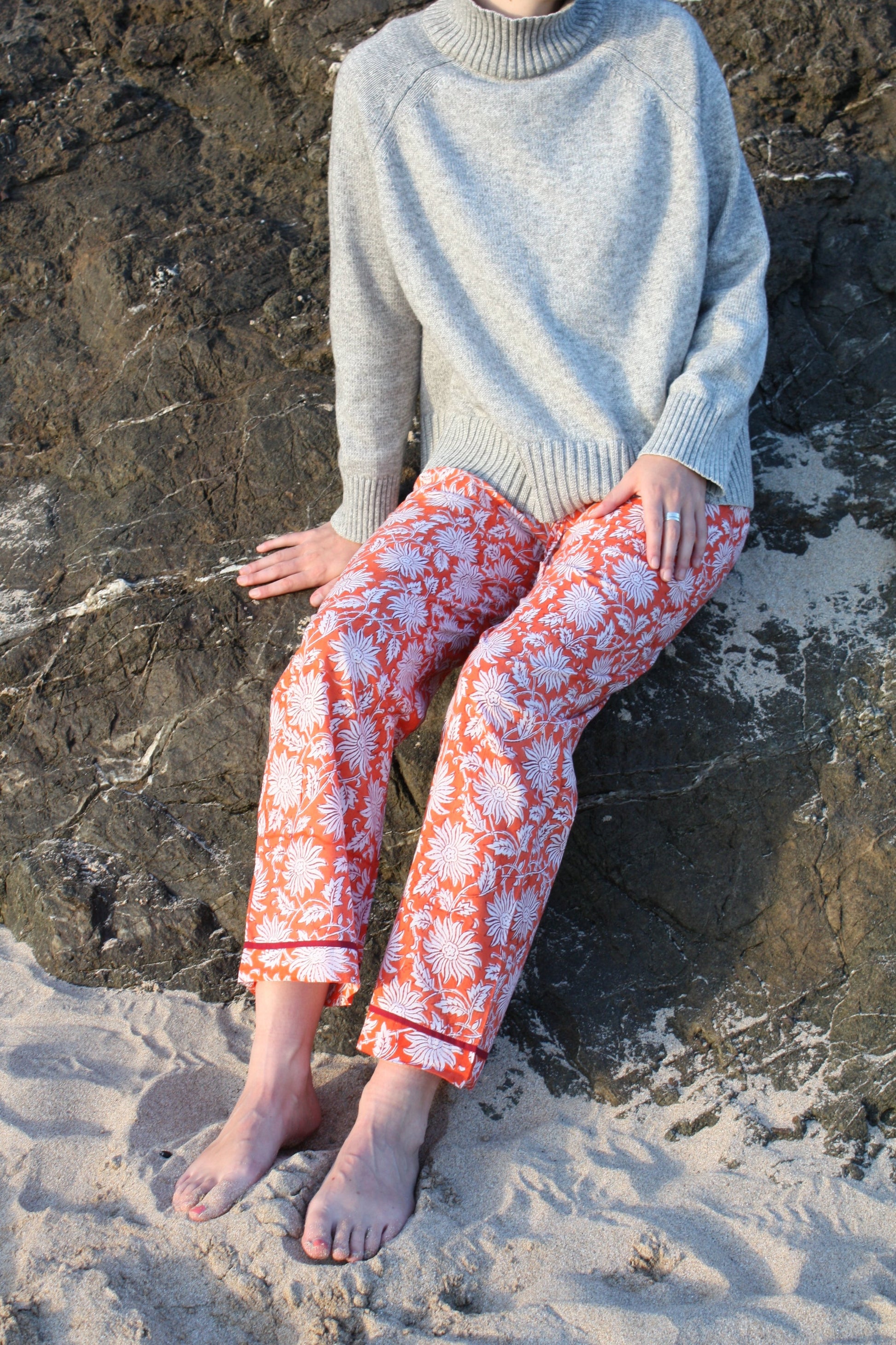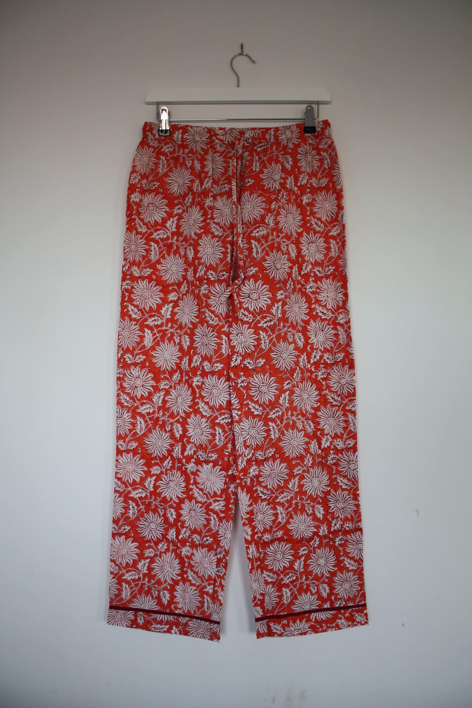 Block printed pyjama bottoms handmade in Jaipur. The fabric is hand printed so please allow for small discrepancies in designs as each pair is unique.